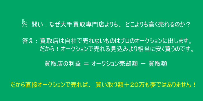 細かいオプションの価値までを含め、プロの業者が数ヶ月の相場を参考に落札しますので、最も高い業界適正価格で落札されるのです。
